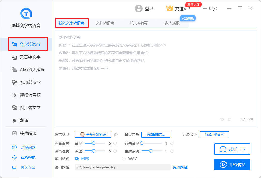 进入「文字转语音」功能,将文字转换成语音。可自定义「语音类型」、「背景音乐」、「音量」、「语速」、「背景音量」、「输出格式」等文字转语音参数。