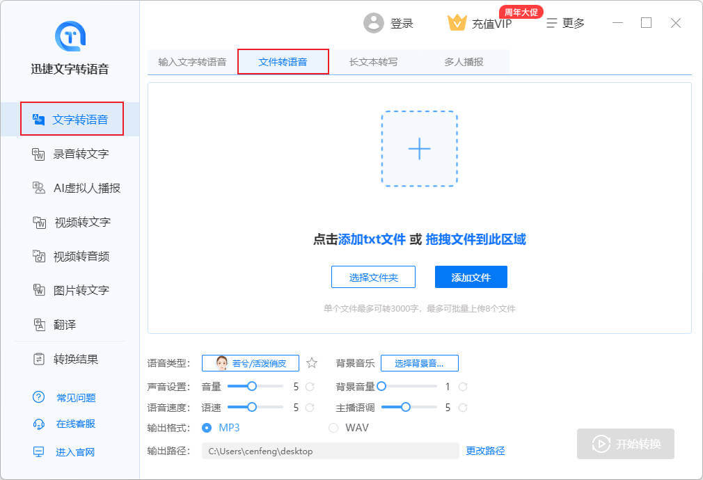 进入「文件转语音」功能,将txt文件内的纯文本信息转换为语音。可自定义「语音类型」、「背景音乐」、「音量」、「语速」、「背景音量」、「输出格式」等文字转语音参数。