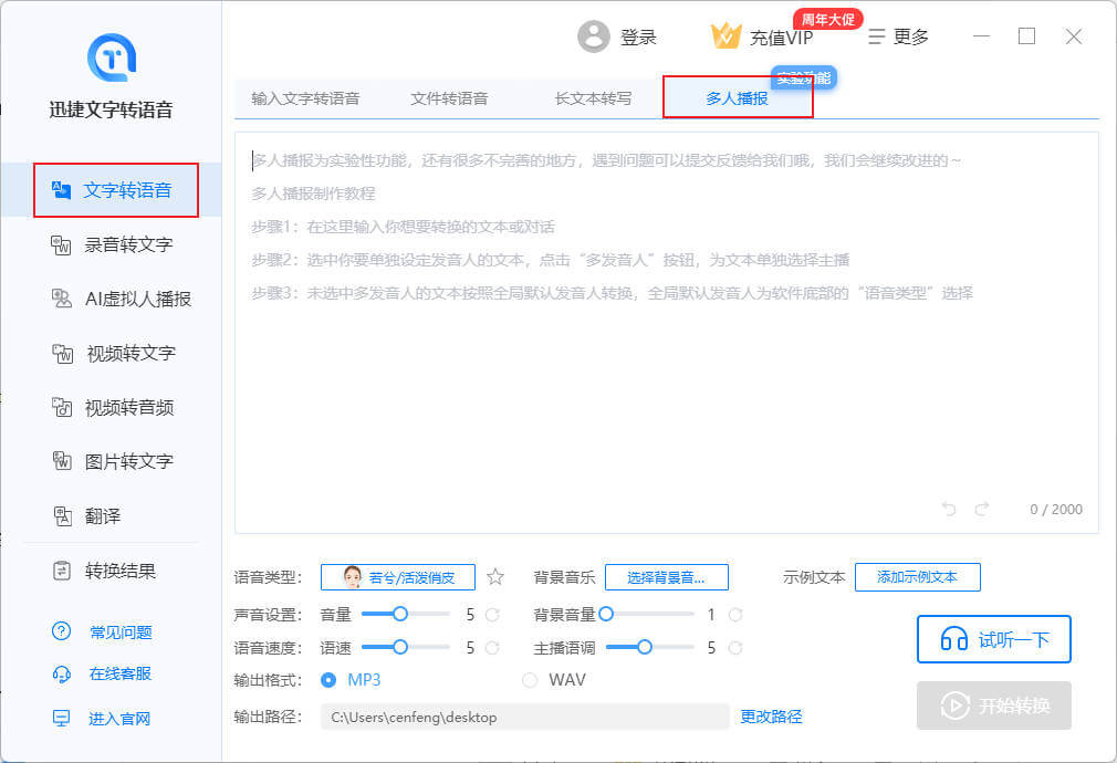 进入「多人播报」功能,将文字以对话的形式转换成语音。可自定义「多音字」、「多发音人」、「时间间隔」、「语音类型」、「背景音量」等转换参数。