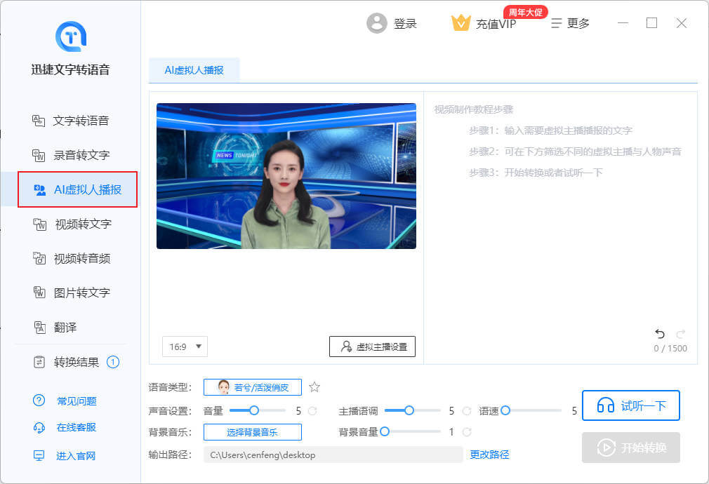 เข้าสู่ฟังก์ชั่น "AI Virtual Man Broadcast" ซึ่งสามารถสร้างข้อความที่ป้อนเป็นวิดีโอ Virtual Man Broadcast ได้ สนับสนุนการสร้างพารามิเตอร์ที่กำหนดเอง "virtual caster", "voice type", "background volume" เป็นต้น